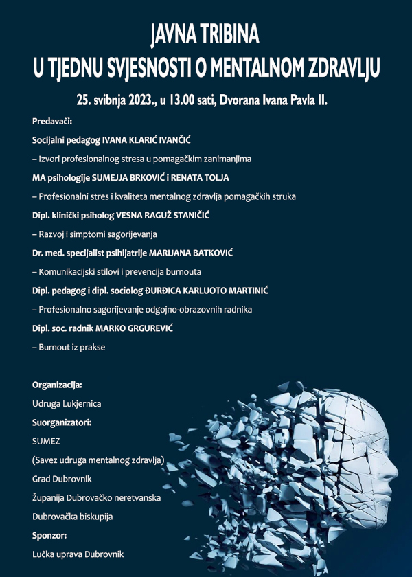 Vrhunski dubrovački stručnjaci na još jednoj Javnoj tribini u organizaciji Udruge Lukjernica, u Europskom tjednu svjesnosti o mentalno zdravlju 2023. godine