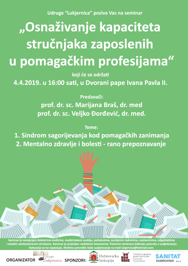 Za sve one koji brinu o osjetljivim skupinama društva odlučili smo održati seminar o sindromu sagorijevanja kod pomagačkih zanimanja i pozvali vrsne predavače dr Marijanu Braš i dr Veljka Đorđevića