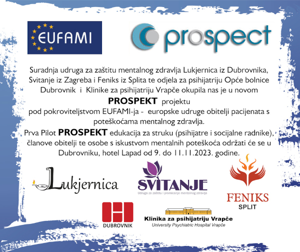 Europska udruga obitelji pacijenata s poteškoćama mentalnog zdravlja suorganizator je prve hrvatske inačice njihovog projekta Prospect u kojem sudjeluju stručnjaci (psihijatri, psiholozi, socijalni radnici…), članovi obitelji i prijatelji te osobe s iskustvom mentalnih poteškoća.